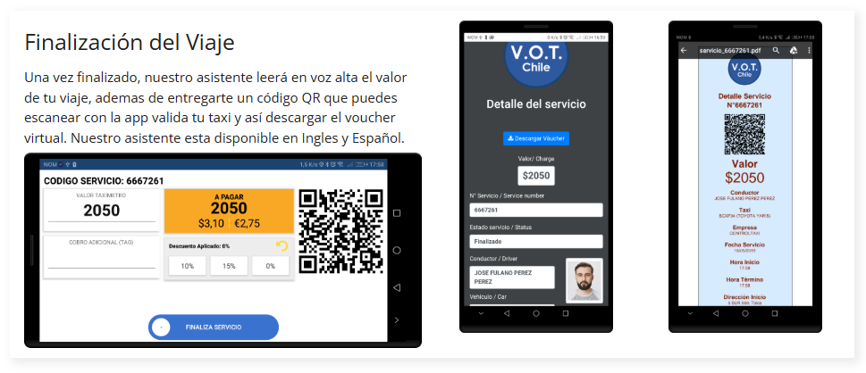 El Validador Operacional de Transporte (V.O.T.) es una iniciativa que busca transparentar y entregar mayor confianza al usuario del servicio de taxi, a través de un validador de transporte que conecta al taxi con una plataforma de validación del cumplimiento normativo directamente al registro del MTT.